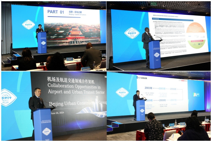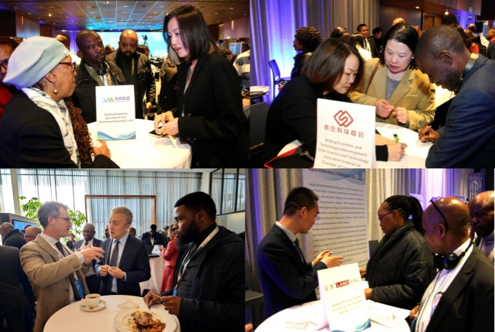 北京市贸促会和豪登省投资促进局分别推介北京和南非投资环境和机遇。金隅集团、城建集团、予果生物、蓝派沥青、北京经开区科创企业商会分别推介绿色建材、装备和水泥行业升级合作机会,机场及轨道交通领域合作契机,用测序技术改善感染性疾病诊断,环保低噪音耐用公路技术,商会业务及合作意向等。