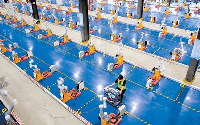 越疆智能科技有限公司位于山东日照经济技术开发区,该公司生产的协作机器人产品出口到全球80多个国家和地区。图为近日,在该公司生产基地车间,排列整齐的机械臂在接受测试。